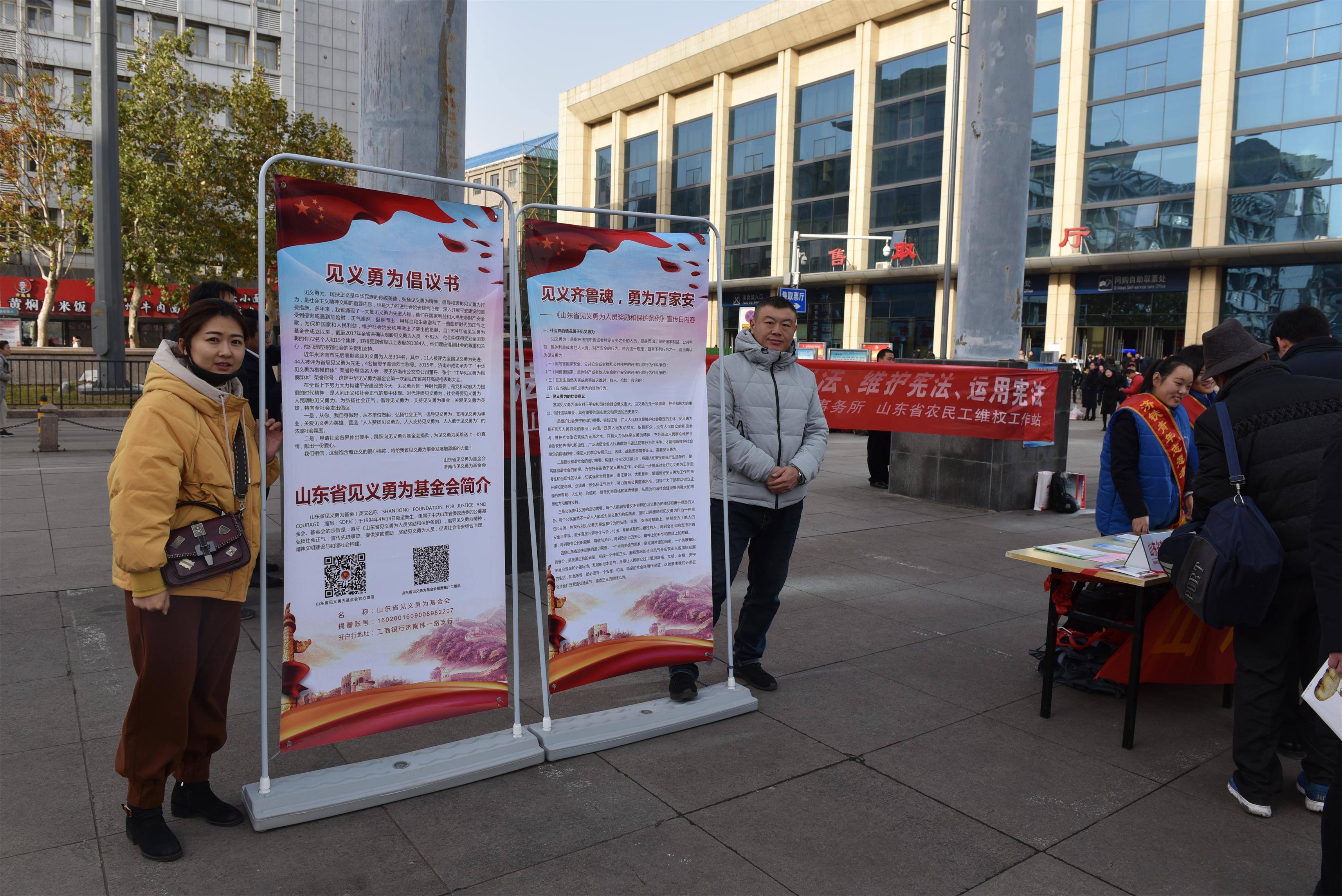 为深入贯彻落实习近平总书记全面依法治国新理念、新思想、新战略,大力推动《山东省见义勇为人员奖励和保护条例》的贯彻落实,弘扬见义勇为精神,倡导见义勇为行为,宣传见义勇为英雄事迹,2018年12月4日上午,在第五个宪法宣传日到来之际,山东省见义勇为基金会联合山东舜天律师事务所在济南火车站广场举办了《山东省见义勇为人员奖励和保护条例》宣传日活动。山东省见义勇为基金会理事长刘丕峰出席活动并接受新闻媒体采访,秘书长李尚禄参加活动。