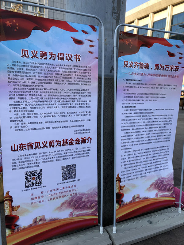 活动现场设置了宣传展板,同时山东省见义勇为基金会与济南市见义勇为基金会工作人员耐心地向来往的群众讲解见义勇为政策规定,宣传见义勇为的社会意义,呼吁群众赞扬见义勇为,支持见义勇为工作。工作人员发放了见义勇为宣传单、见义勇为倡议书、见义勇为笔记本等各类宣传材料。通过宣传让群众充分认识到见义勇为对于平安和谐社会建设意义重大,从而营造“人人赞扬见义勇为、人人支持见义勇为、人人敢于见义勇为”的浓厚社会氛围。