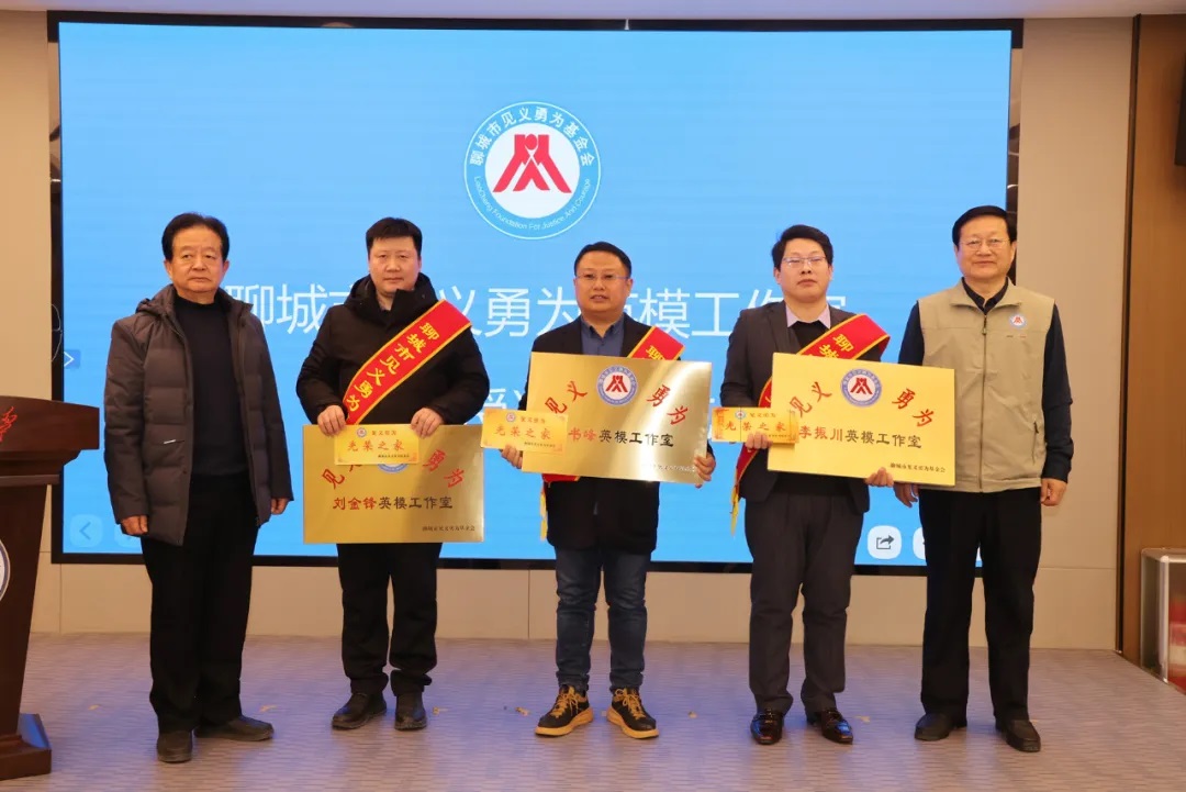 聊城市见义勇为基金会副理事长兼秘书长孙留功,高唐县见义勇为协会会长王其平共同向“见义勇为李振川英模工作室”“见义勇为王书峰英模工作室”“见义勇为刘金锋英模工作室”授牌。