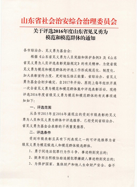 关于评选2016年度山东省见义勇为模范和模范群体的通知