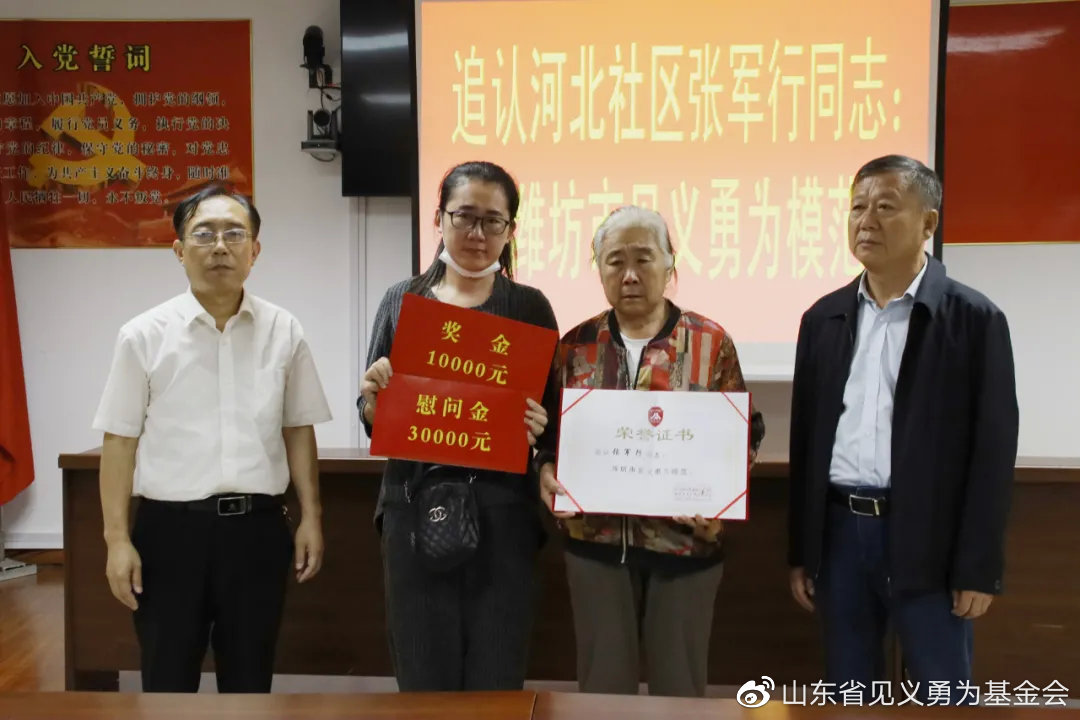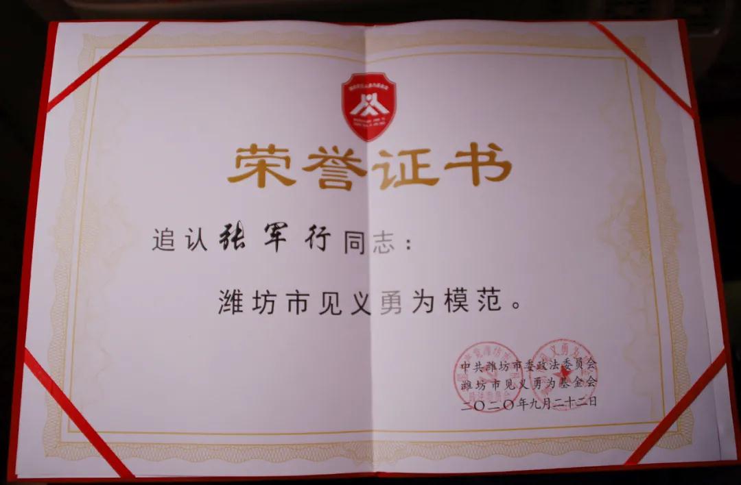 9月29日,救儿童牺牲者张军行获“潍坊市见义勇为模范”称号表彰仪式举行。潍坊市委政法委副书记尹守庆、市见义勇为基金会理事长杜士忠等一行来到张军行生前所住的社区,向张军行的家属颁发证书,并送去奖金和慰问金。