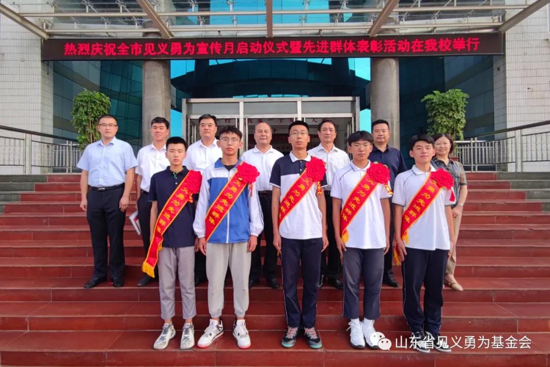 本次滕州市见义勇为宣传月启动仪式暨先进群体表彰活动在5位少年的母校――滕州市实验高中隆重举行。枣庄市委政法委副书记孟凡华、枣庄市见义勇为基金会理事长李中奇,滕州市委常委、统战部部长、政法委书记刘庆东,滕州市政协副主席、教体局局长杜孝玺出席活动。会上专门为“泰山爱心救助”五少年见义勇为先进群体进行颁奖,宣读了《关于开展见义勇为集中宣传月活动的通知》《关于对枣庄市见义勇为先进群体进行表彰奖励的决定》,并由滕州实验高中负责同志、学生代表分别作典型发言,发出倡议。