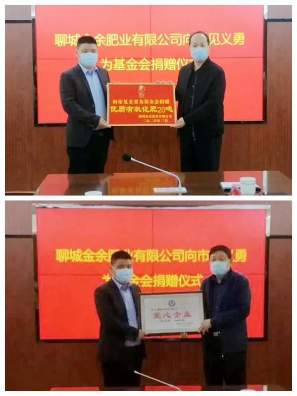 疫情可以挡住人们出行的脚步,但挡不住爱心的传递!3月24日下午,聊城金余肥业有限公司总经理刘明携业务经理张炳西、财务主管赵云等一行四人专程到市见义勇为基金会,向基金会捐赠20吨价值五万元的优质有机肥,用于扶助农村见义勇为人员困难家庭。聊城市见义勇为基金会理事长付强、监事长徐文萌,市见义勇为基金会理事、市工商联办公室主任李铖铖参加捐赠仪式。