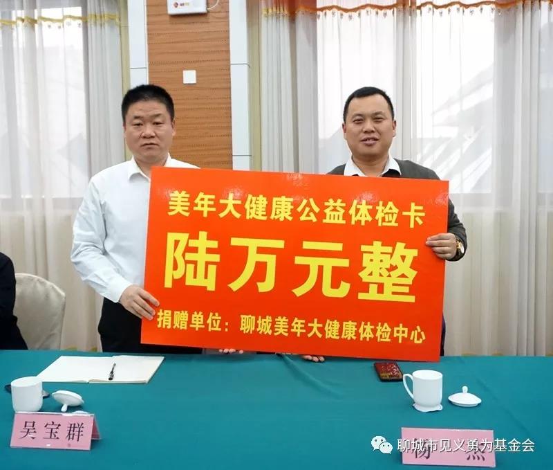 市见义勇为基金会秘书长吴宝群代表基金会接受聊城美年大健康体检中心捐赠的价值六万元的爱心体检卡。