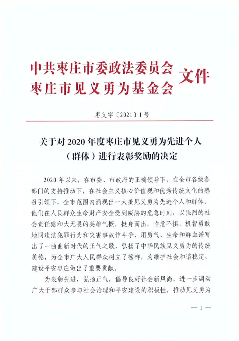 3月15日,为表彰先进,弘扬正气,倡导良好社会新风尚,枣庄市委政法委、市见义勇为基金会印发表彰决定,对郑广铎等32名见义勇为先进分子进行表彰奖励,授予马威等10名同志“枣庄市见义勇为先进个人”称号,授予郑广铎等22名同志“枣庄市见义勇为先进群体”称号,共计发放奖金20万元。对于见义勇为人员表彰奖励工作,市委政法委、市见义勇为基金会高度重视,严格按照《山东省见义勇为人员奖励和保护条例》《枣庄市
