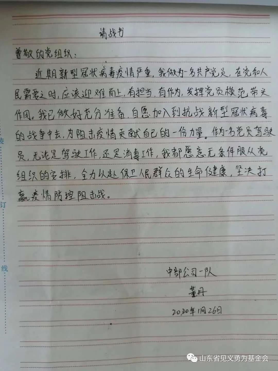 ――枣庄市见义勇为先进分子王琪疫情防控事迹 2月8日,滕州市级索镇后杨岗村党支部收到了一份特殊的入党申请书。申请人名叫王琪,是后杨岗村村民。写入党申请书时,他正在赶赴援建武汉雷神山医院途中的大巴车上。“虽然我现在还不是一名党员,但我将继续以共产党员的标准要求自己,在援建武汉雷神山医院过程中,冲在一线、拼搏奉献,为抗击疫情贡献力量!”这是王琪在申请书里写下的铮铮誓言。