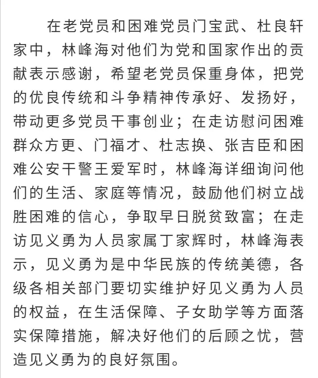 林峰海要求,各级各部门要牢记初心和使命,带着感情、带着责任做好群众工作,认真落实各项政策,真心实意办实事、做好事,让广大群众获得更多实惠,不断增强获得感、幸福感、安全感。