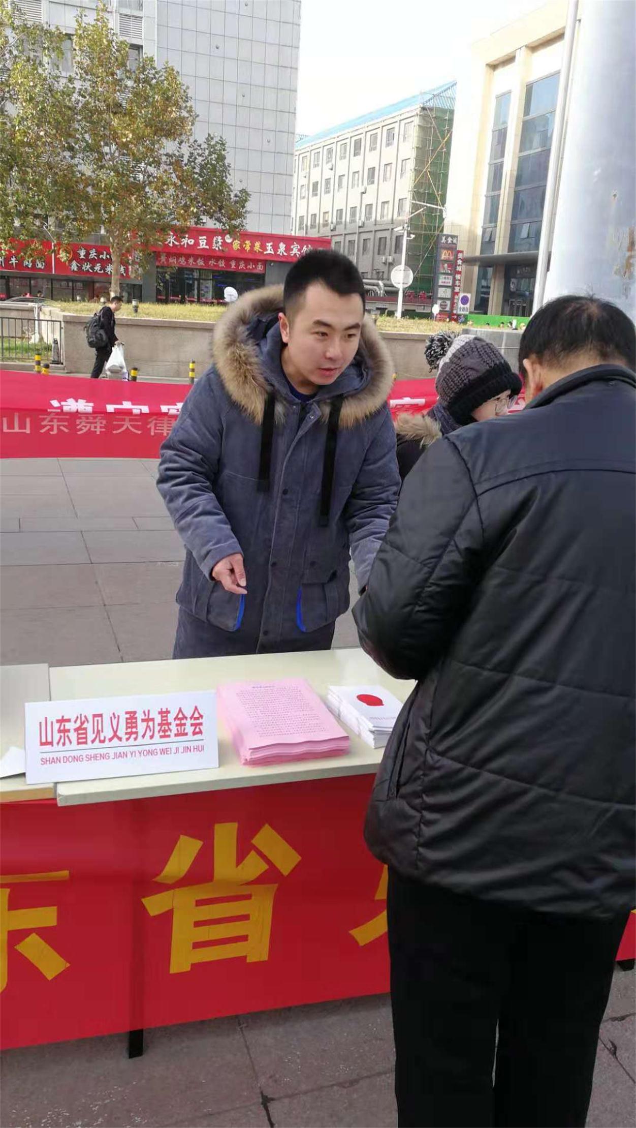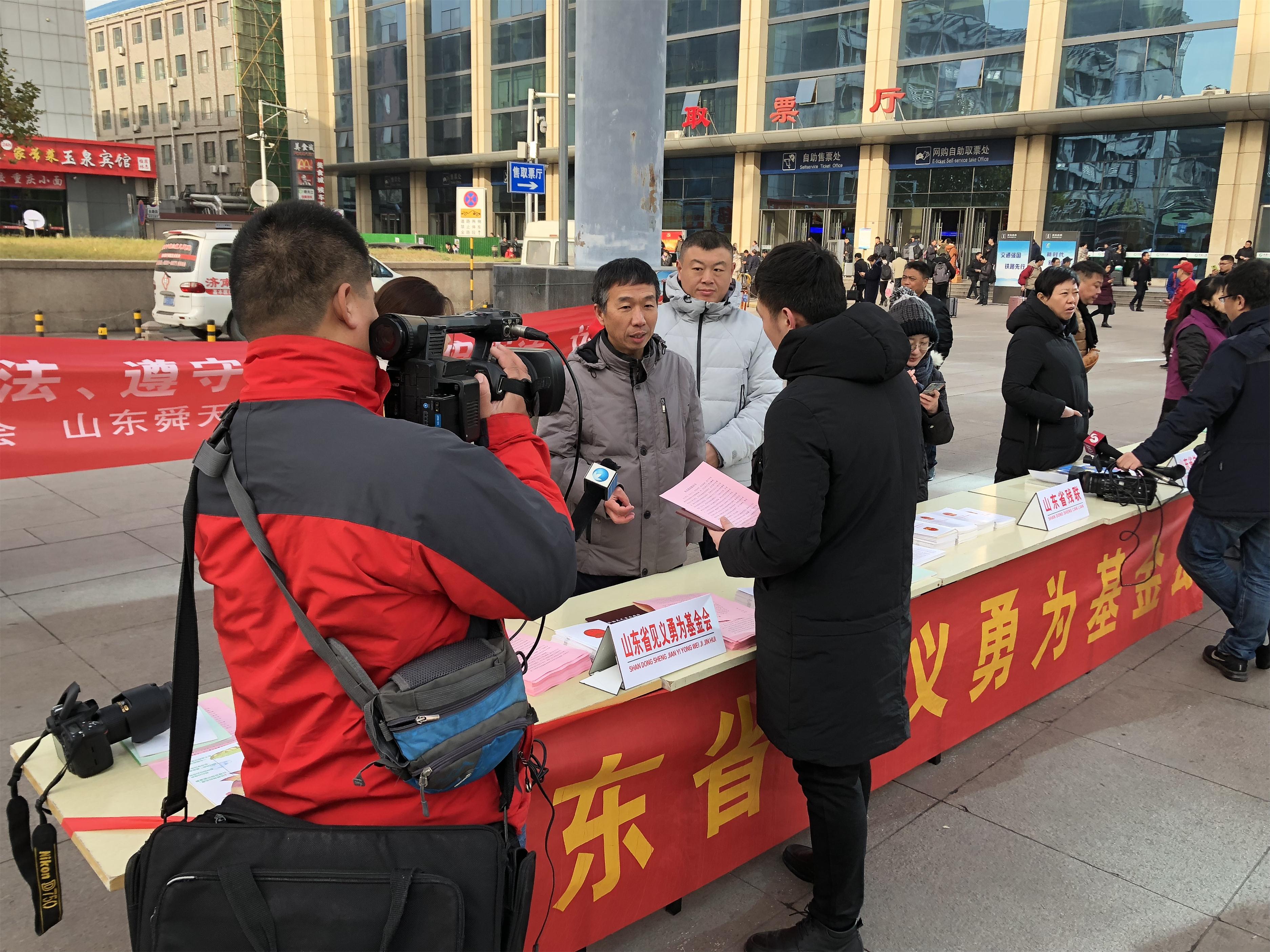 为深入贯彻落实习近平总书记全面依法治国新理念、新思想、新战略,大力推动《山东省见义勇为人员奖励和保护条例》的贯彻落实,弘扬见义勇为精神,倡导见义勇为行为,宣传见义勇为英雄事迹,2018年12月4日上午,在第五个宪法宣传日到来之际,山东省见义勇为基金会联合山东舜天律师事务所在济南火车站广场举办了《山东省见义勇为人员奖励和保护条例》宣传日活动。山东省见义勇为基金会理事长刘丕峰出席活动并接受新闻媒体采访,秘书长李尚禄参加活动。