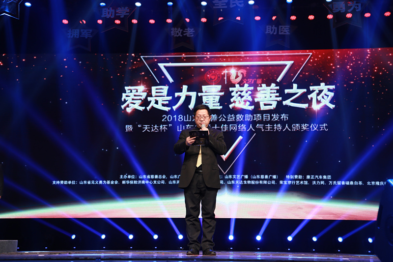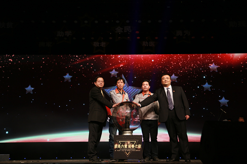 (省见义勇为基金会理事长刘丕峰、省慈善总会副会长兼秘书长张彦龙省、见义勇为模范群体代表刘春明、李世增共同启动2018山东省慈善救助项目―勇为篇,慈善之星)