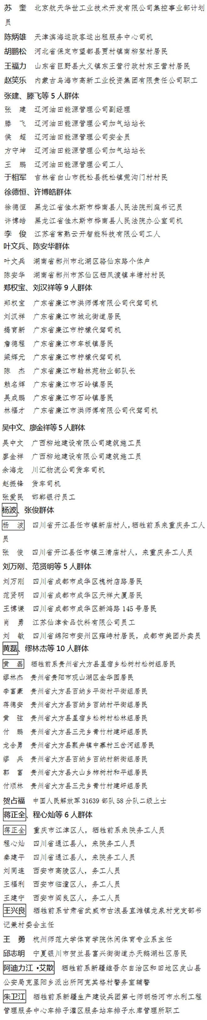 陕西省25. 蒋正全,男,1978年3月生,重庆市江津区人,牺牲前系来陕务工人员;程心灿,男,1990年11月生,四川省通江县人,来陕务工人员;秦建平,男,1996年5月生,四川省通江县人,来陕务工人员;刘同连,男,1970年8月生,西安市高陵区人,务工人员;王福利,男,1971年4月生,西安市临潼区人,务工人员;王建宁,男,1964年1月生,西安市阎良区人,务工人员。2022年8月8日11时53分,西安市阎良区武屯街道新庄村谢某等5名村民驾车行驶途中不慎坠入二龙口水库。途经此处的蒋正全、程心灿、秦建平3人听到呼救声后,奋不顾身跳入河中救人,刘同连、王建宁、王福利3人也相继加入救援队伍。蒋正全先托起一个孩子推向岸边,剩下4人陆续从车窗中被救出,最终车内5人全部获救。蒋正全在救人过程中因体力不支沉入水底,后被搜救出来紧急送医,经抢救无效英勇牺牲。蒋正全用生命完成最后的托举,彰显了他见义勇为的高尚品格。蒋正全、程心灿、秦建平、刘同连、王建宁、王福利虽然都是默默无闻的务工人员,但他们用行动弘扬了见义勇为精神,感动了西安、重庆两座城市,感动了无数中国人。8月18日,蒋正全、程心灿、秦建平、刘同连、王建宁、王福利抢险救人行为被依法确认为见义勇为行为。9月2日,中华见义勇为基金会对蒋正全、程心灿等6人进行及时奖励慰问。