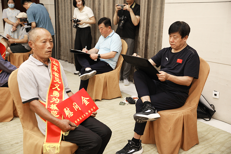 仪式上,省见义勇为基金会为爱心企业国井集团颁发捐赠奖牌及证书,并为15名淄博市见义勇为模范发放慰问金。国井集团负责人、淄博市见义勇为模范代表分别作了致辞和发言。省内外知名书画家现场书画,并向爱心企业和受到慰问的见义勇为模范赠送慰问书画作品。